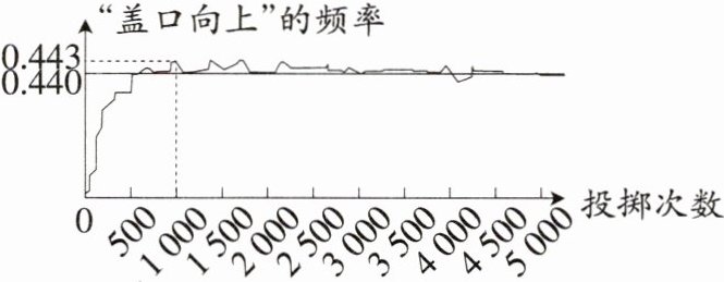 解:根据题图中数据可得,“盖口向上”的频率稳定在0.440附近,所以“盖口向上”的可能性小,“盖口向下”的可能性大。