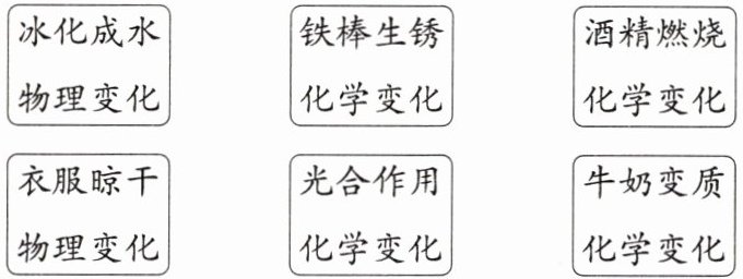 冰化成水 物理变化 铁棒生锈 化学变化 酒精燃烧 化学变化