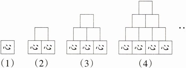 9 新趋势 规律探究题 小明用大小和形状都完全一样的正方体按照一定规律摆放成一组图案(如图所示),每个图案中只在最下面的正方体上写“心”字,寓意“不忘初心”。其中第(1)个图案中有1个正方体,第(2)个图案中有3个正方体,第(3)个图案中有6个正方体,……按照此规律,从第(100)个图案所需正方体中随机抽取一个正方体,抽到带“心”字正方体的概率是 ( )