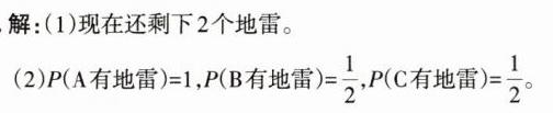 12 (10分)(山西阳泉平定县期末)如图是扫雷游戏的一部分(说明:图中数字2表示在以该数字为中心的8个方格中有2个地雷)。小旗表示该方格已被探明有地雷,现在还剩下A,B,C三个方格未被探明,其他地方为安全区(包括有数字的方格)。