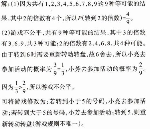 15 (12分)小亮和小芳都想参加学校社团组织的暑假实践活动,但只有一个名额,小亮提议用如下的办法决定谁去参加活动:将一个转盘平均分成9等份,分别标上1至9九个号码,随意转动一次转盘,若转到2的倍数,小亮去参加活动;若转到3的倍数,小芳去参加活动;转到6或者其他号码,则重新转动转盘。