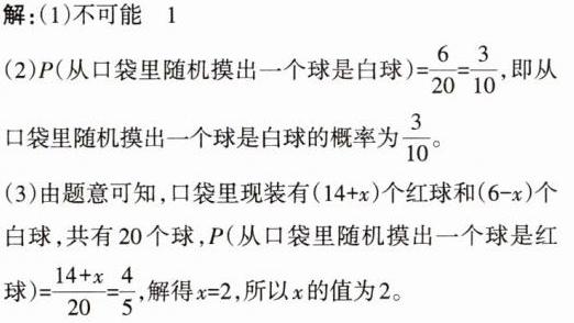 (3)从口袋里取走x个白球后,再放入x个红球,并充分摇匀,如果随机摸出红球的概率是$\frac{4}{5}$,求x的值。