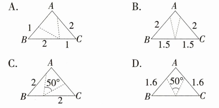 6 (河南郑州郑东新区期末)在△ABC中,∠B=∠C=50°,将△ABC沿图中虚线剪开,剪下的两个三角形不一定全等的是 ( )