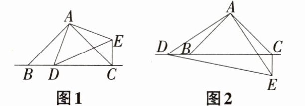 (2)当点D在线段CB的延长线上时,如图2,判断CE与BC的位置关系,并说明理由。