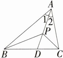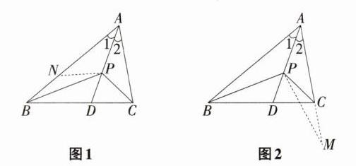 补短法:如图2,延长AC至点M,使AM = AB,连接PM。 在△ABP和△AMP中,因为AB = AM,∠1 = ∠2,AP = AP, 所以△ABP≌△AMP,所以PB = PM。 在△PCM中,CM>PM - PC,所以AM - AC>PB - PC, 所以AB - AC>PB - PC。→等量代换。