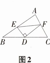 如图2,在△ABC中,点D是BC的中点,DE⊥DF于点D,DE交AB于点E,DF交AC于F,连接EF,判断BE + CF与EF的大小关系并说明理由;