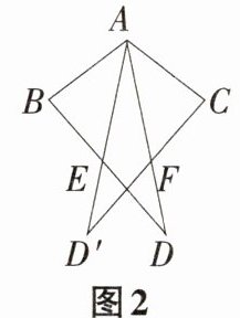 (2)操作二:对折后,将风筝纸片剪成两个三角形(△ABD和△ACD'),摆成如图2所示的图形,BD与AD'相交于点E,AD与CD'相交于点F。试说明:BE=CF。