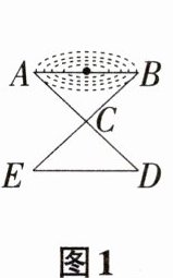 甲:如图1,先在平地取一个可直接到达A,B的点C,再连接AC,BC,并分别延长AC至D,BC至E,使DC = AC,EC = BC,最后测出DE的长即为A,B的距离。