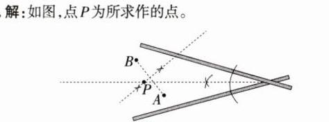 8 新情境·生产生活 近年来,我国快递企业不断加大枢纽节点建设力度,投用智慧科技、电商物流产业园,启用分拨、仓储中心,推动产业设施升级。如图,两条公路相交,在A,B两处是两个居民区,某快递企业要在居民区旁边修建一个快递点,为了使快件取送方便,要使快递点到两条公路的距离相等,并且到两个居民区的距离也相等,请你通过尺规作图找到一个这样的点。