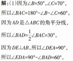 5 (河南南阳唐河县阶段练习)如图,在△ABC中,∠B=50°,∠C=70°,AD是△ABC的角平分线,DE⊥AB于点E。