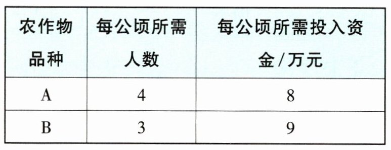 6(安徽中考)乡村振兴战略实施以来,很多外出人员返乡创业.某村有部分返乡青年承包了一些田地,采用新技术种植A、B两种农作物,种植这两种农作物每公顷所需人数和投入资金如表: