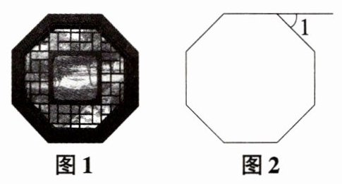 8 (甘肃兰州中考)如图1是我国古建筑墙上采用的八角形空窗,其轮廓是一个正八边形,窗外之境如同镶嵌于一个画框之中,如图2是八角形空窗的示意图,它的一个外角∠1 = ( )