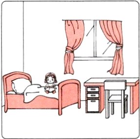 Look at the three bedrooms. The big one is for my parents. The bedroom with a toy is mine(我的). There is a doll on my 4. b______. The last bedroom is for guests(客人).