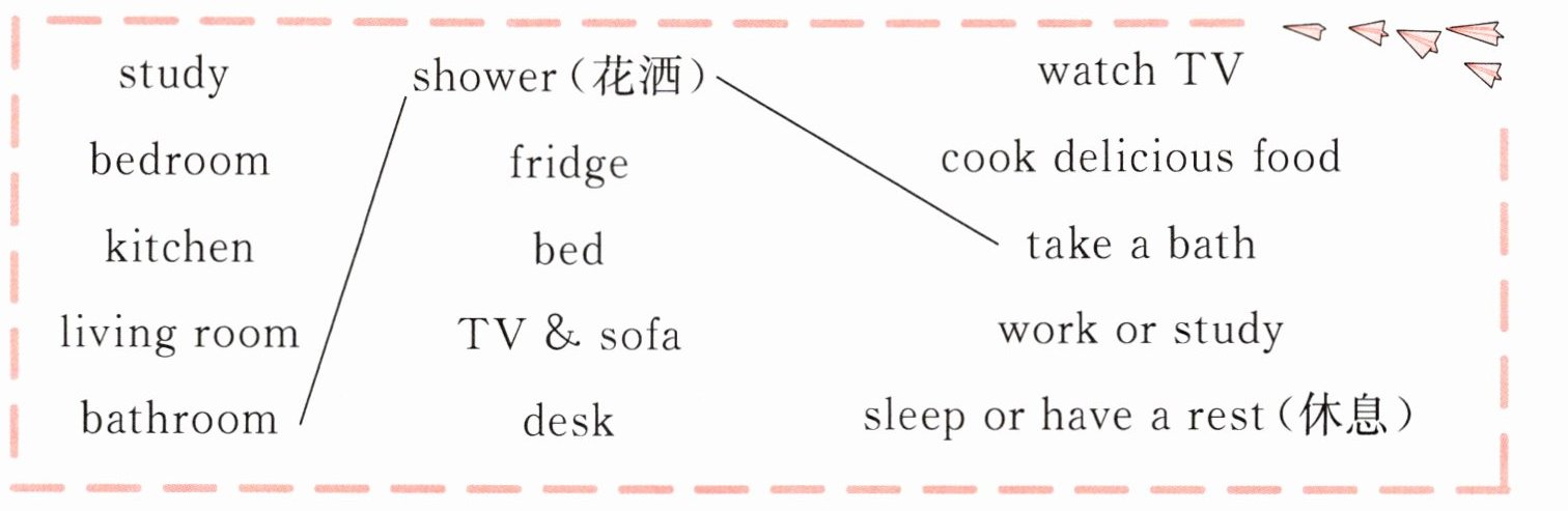 五、房间里都有什么物品?Lucy在不同的房间又能进行什么活动呢?将下面的房间与所对应的物品、活动进行连线,再将句子补充完整并进行仿写。