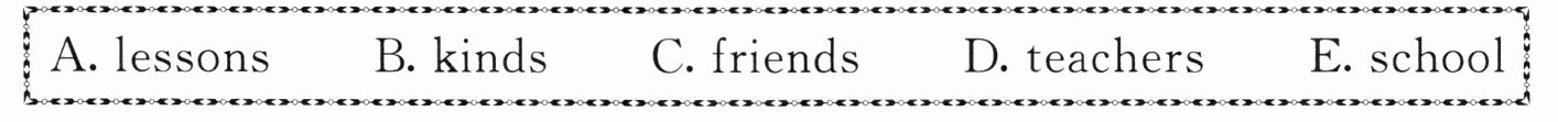 Children are usually in primary school(小学) from 6 to 12 years old. We have a good time at 1. ______. We have many 2. ______ and our 3. ______ make up(创编) all 4. ______ of games to help us learn. In class, we read books, write stories, sing songs and dance. We can make many 5. ______ at school and we are very happy!