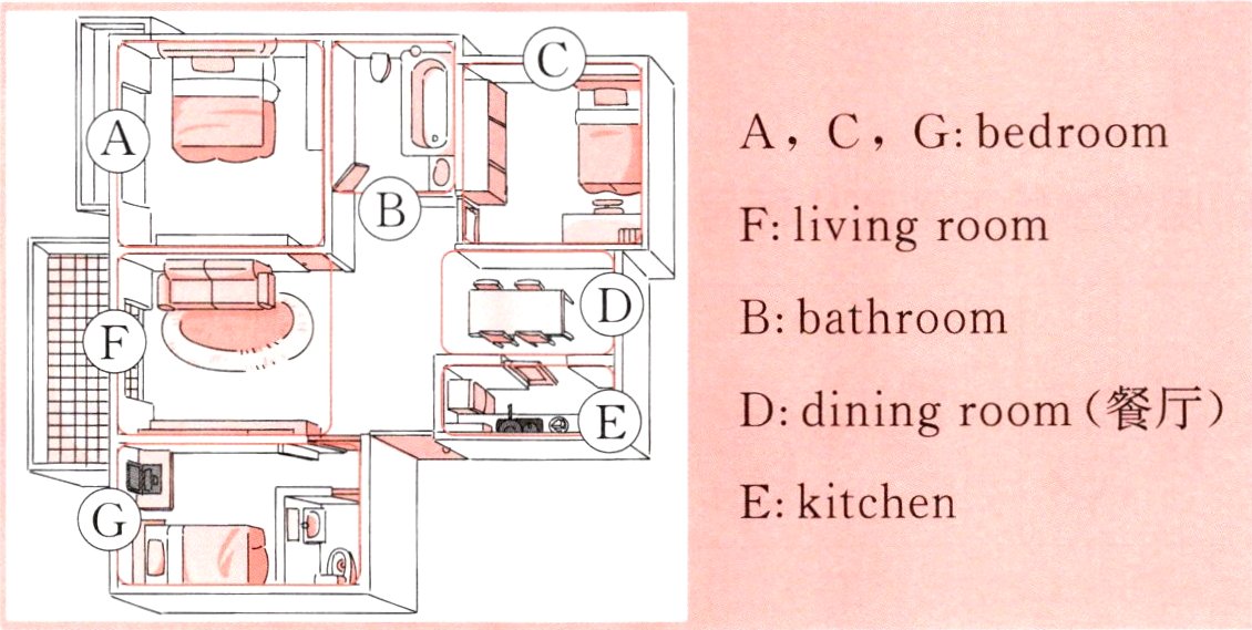 (一)看图,根据大家的描述,将每个人所在房间的序号写在括号内。