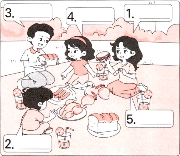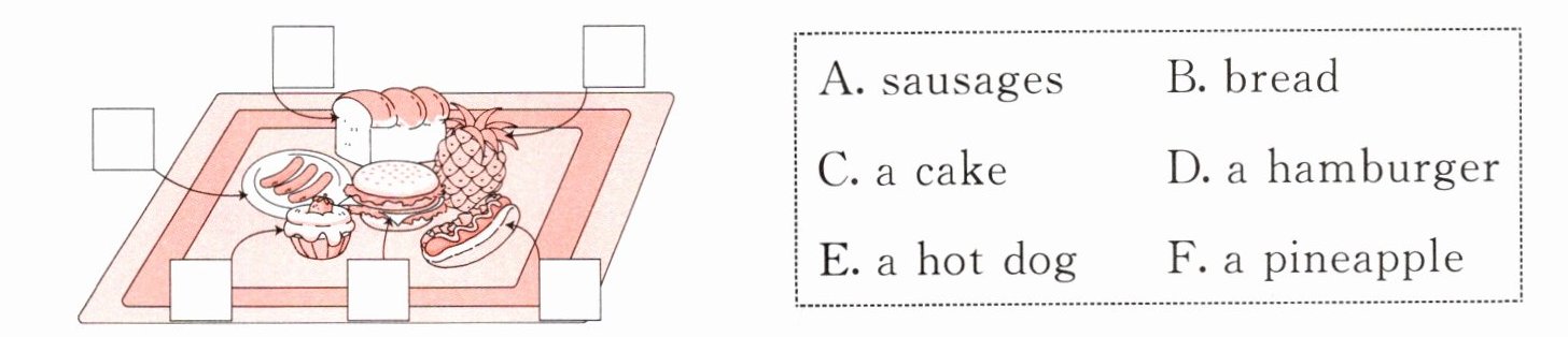 一、为野餐垫上的食物贴上合适的标签,将其序号填入相应方框中。