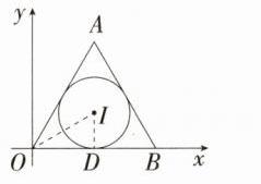 $(\sqrt{3},1)$。解析:如图,连接$OI$,作$ID$垂直于$x$轴,垂足为$D$。因为等边$\triangle OAB$的边长为$2\sqrt{3}$,$I$是内心,所以$OD=\frac{1}{2}OB=\sqrt{3}$,$\angle IOD=\frac{1}{2}\angle AOB = 30^{\circ}$,所以$ID = OD\cdot\tan30^{\circ}=1$,所以点$I$的坐标为$(\sqrt{3},1)$。