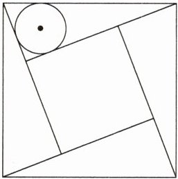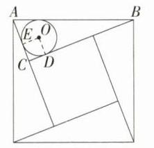 289。解析:如图,设内切圆的圆心为$O$,$D$、$E$分别为$\odot O$与$BC$、$AC$的切点,连接$OE$、$OD$,则四边形$EODC$为正方形,所以$OE = OD = 3=\frac{AC + BC - BA}{2}$,所以$AC + BC - AB = 6$,所以$AC + BC = AB + 6$,所以$(AC + BC)^{2}=(AB + 6)^{2}$,所以$BC^{2}+AC^{2}+2BC\cdot AC = AB^{2}+12AB + 36$,又$BC^{2}+AC^{2}=AB^{2}$,所以$2BC\cdot AC = 12AB + 36$①,因为小正方形的面积为49,所以$(BC - AC)^{2}=49$,所以$BC^{2}+AC^{2}-2BC\cdot AC = 49$,即$AB^{2}-2BC\cdot AC = 49$②,把①代入②,得$AB^{2}-12AB - 85 = 0$,所以$(AB - 17)(AB + 5)=0$,所以$AB = 17$(负值已舍去),所以大正方形的面积为289。