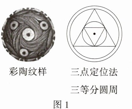 14.跨历史·彩陶 (2024甘肃中考,20,★☆☆)马家窑文化以发达的彩陶著称于世,其陶质坚固,器表细腻,红、黑、白彩共用,彩绘线条流畅细致,图案繁缛多变,形成了绚丽典雅的艺术风格,创造了一大批令人惊叹的彩陶艺术精品,体现了古代劳动人民的智慧.图1中的彩陶纹样呈现的是三等分圆周,古人用等边三角形三点定位的方法确定圆周的三等分点,这种方法和下面三等分圆周的方法相通.如图2,已知⊙O和圆上一点M.作法如下: