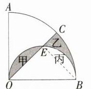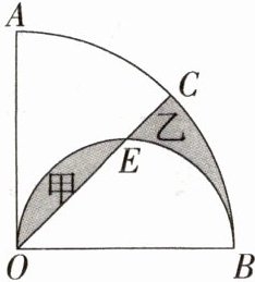 解析:如图,连接$BE$。$\because OB$为半圆$OEB$的直径,$\therefore\angle OEB = 90^{\circ}$,$\because\angle EOB = 45^{\circ}$,$\therefore\angle OBE = 45^{\circ}$,$\therefore OE = BE$,$\therefore S_{甲}=S_{丙}$,$\therefore S_{阴影}=S_{甲}+S_{乙}=S_{丙}+S_{乙}=S_{扇形BOC}-S_{\triangle OEB}$,$\because OB = 10$,$\therefore OE = BE = 5\sqrt{2}$,$\therefore S_{阴影}=\frac{45\pi\times10^{2}}{360}-\frac{1}{2}\times5\sqrt{2}\times5\sqrt{2}=\frac{25}{2}\pi - 25$。