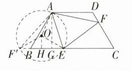 **解析**:存在。如图,将△ADF绕点A顺时针旋转120°得到△ABF',易知F'、B、E三点共线。\n由旋转得AF' = AF,∠F'AB = ∠FAD。\n因为AD//BC,∠ABC = 60°,所以∠BAD = 120°。\n因为∠EAF = 60°,所以∠EAB+∠DAF = 60°,所以∠F'AE = ∠F'AB+∠BAE = ∠FAD+∠BAE = 60° = ∠EAF。\n因为AE = AE,AF' = AF,所以△FAE≌△F'AE(SAS)。\n作△AEF'的外接圆⊙O,过O作OH⊥EF'于点H,过A作AG⊥BC于点G,连接OF',OE,则∠F'OH=$\frac{1}{2}∠F'OE = ∠F'AE = 60°$。\n设⊙O的半径为r,则OH=$\frac{r}{2}$,F'H=$\frac{\sqrt{3}r}{2}$,所以EF'=$\sqrt{3}r$。\n因为AB = 4,∠ABC = 60°,所以AG = 2$\sqrt{3}$。\n因为OA+OH≥AG,所以r+$\frac{r}{2}≥2\sqrt{3}$,所以r≥$\frac{4\sqrt{3}}{3}$。\n所以$S_{\triangle AEF}=S_{\triangle AEF'}=\frac{1}{2}EF'\cdot AG=\frac{1}{2}\times\sqrt{3}r\cdot2\sqrt{3}≥4\sqrt{3}$,所以△AEF面积的最小值为4$\sqrt{3}$。