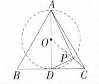 **解析**:因为等边△ABC的边长为4,D为BC边的中点,所以∠ADC = 90°,所以∠ADP+∠PDC = 90°。\n因为∠PAD = ∠PDC,所以∠PAD+∠ADP = 90°,所以∠APD = 90°。\n所以点P在以AD为直径的⊙O上,如图,连接OC,当P在OC上时,PC的长最小。\n在Rt△ADC中,AC = 4,CD = 2,所以AD=$\sqrt{4^{2}-2^{2}} = 2\sqrt{3}$。\n因为O是AD的中点,所以OD=$\sqrt{3}=OP$。\n由勾股定理,得OC=$\sqrt{OD^{2}+CD^{2}}=\sqrt{(\sqrt{3})^{2}+2^{2}}=\sqrt{7}$,所以CP=$\sqrt{7}-\sqrt{3}$,即线段CP长的最小值为$\sqrt{7}-\sqrt{3}$。