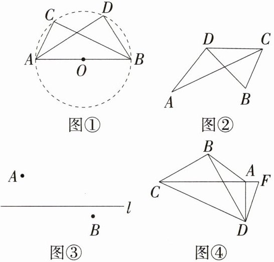 (3)如图④,在四边形ABCD中,∠CAD = 90°,CB⊥DB,点F在CA的延长线上,连接DF,∠ADF = ∠ABD.求证:DF是△ACD外接圆的切线.