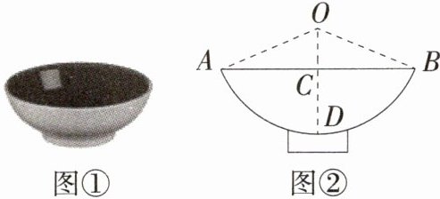 13. 陕西饮食文化源远流长,“老碗面”是陕西地方特色美食之一. 图②是从正面看到的一个“老碗”(图①)的形状示意图.$\overset{\frown}{AB}$是⊙O的一部分,D是$\overset{\frown}{AB}$的中点,连接OD,与弦AB交于点C,连接OA,OB. 若AB = 24 cm,碗深CD = 8 cm,则⊙O的半径OA为________.