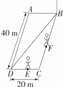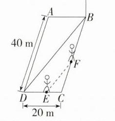 B:连接$EF$,如图, 由题可知$EF// BD$,$\therefore\triangle CEF\sim\triangle CDB$, $\therefore\frac{CE}{CD}=\frac{CF}{CB}$, $\because$两人同时从点$B$出发,沿着平行四边形边缘顺时针跑步,且甲的速度是乙的速度的2倍, $\therefore BC + CE = 2BF = 40 + CE$,$\therefore BF=\frac{1}{2}(40 + CE)=20+\frac{1}{2}CE$,$\therefore CF = 40 - 20-\frac{1}{2}CE = 20-\frac{1}{2}CE$,$\therefore\frac{CE}{20}=\frac{20-\frac{1}{2}CE}{40}$,$\therefore CE = 8\text{ m}$,故选B。