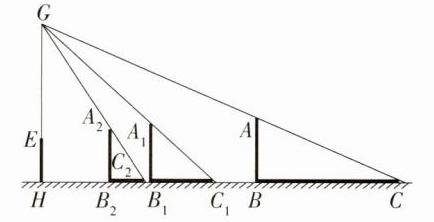 (3)$\frac{3}{n + 1}$。 详解:如图,易知$\triangle A_1B_1C_1\sim\triangle GHC_1$, $\therefore\frac{A_1B_1}{GH}=\frac{B_1C_1}{HC_1}$,即$\frac{1.6}{4}=\frac{B_1C_1}{B_1C_1 + 2.25}$,$\therefore B_1C_1 = 1.5\text{ m}$。 同理$\frac{A_2B_2}{GH}=\frac{B_2C_2}{HC_2}$,即$\frac{1.6}{4}=\frac{B_2C_2}{B_2C_2 + 1.5}$,$\therefore B_2C_2 = 1\text{ m}$, $\therefore\frac{1.6}{4}=\frac{B_nC_n}{B_nC_n+\frac{1}{n + 1}\times4.5}$,$\therefore B_nC_n=\frac{3}{n + 1}\text{ m}$。
