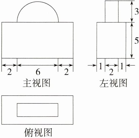 解析:根据三视图可知该几何体由一个长方体和一个半圆柱组成,长方体的长、宽、高分别为10、4、5,半圆柱的高为2,底面半圆的半径为3,