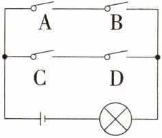 16. 跨物理·电路图(2020江苏泰州中考,4,★☆☆)如图, 电路图上有4个开关A、B、C、D和1个小灯泡, 同时闭合开关A、B或同时闭合开关C、D都可以使小灯泡发光. 下列操作中, “小灯泡发光”这个事件是随机事件的是 ( )