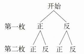 由树状图可知共有4种等可能的结果,其中一枚硬币正面向上,一枚硬币反面向上的结果有2种,所以一枚硬币正面向上,一枚硬币反面向上的概率为$\frac{2}{4}=\frac{1}{2}$。