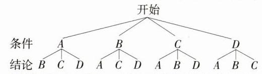 由树状图可知,共有12种等可能的结果,其中能组成真命题的结果有AB,BA,CD,共3种,所以组成真命题的概率是$\frac{3}{12}=\frac{1}{4}$。
