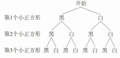 由树状图知,共有8种等可能的结果,其中恰好是两个黑色小正方形和一个白色小正方形的结果有3种,所以恰好是两个黑色小正方形和一个白色小正方形的概率为$\frac{3}{8}$,故选B。
