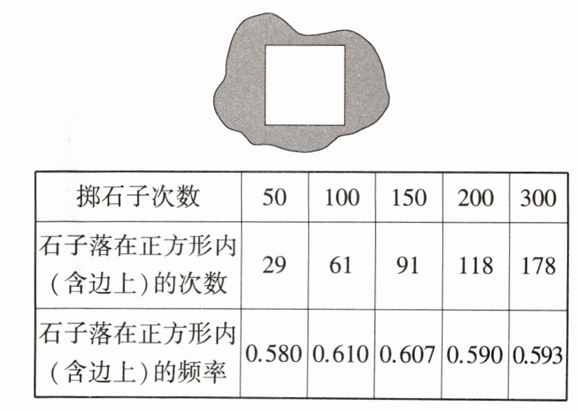 14.(2024贵州六盘水水城期中,15,★☆☆)为了知道一块不规则的封闭图形(如图)的面积,小聪在封闭的图形内画了一个边长为1 m的正方形,在不远处向封闭图形内任意投掷石子,记录数据如下表,则封闭图形的面积约为________$m^{2}$(精确到0.1 $m^{2}$)
