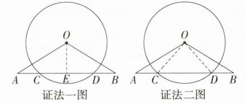 证明\n【证法一】过点O作OE⊥AB于点E,如图。因为OE⊥CD,所以CE = DE;因为AC = BD,所以AC + CE = BD + DE,即AE = BE,所以点O在线段AB的垂直平分线上,所以OA = OB。\n【证法二】连接OC,OD,如图。因为OC = OD,所以∠OCD = ∠ODC,所以∠ACO = ∠BDO;又因为AC = BD,所以△ACO≌△BDO,所以OA = OB。
