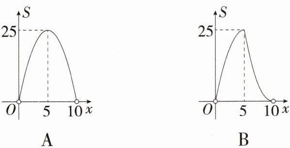 A:连接 OD、OE,如图,设⊙O 的半径为 r,因为⊙O 分别与 AB、BC、AC 相切于点 D、E、F,所以 OD ⊥ AB,OE ⊥ BC,AF = AD = x,CE = CF,所以 CE = CF = 10 - x,易得四边形 ODBE 为正方形,所以 DB = BE = OD = r,所以 S = $\frac{1}{2}r(AB + CB + AC)=\frac{1}{2}r(x + r + 10 - x + 10)=r^{2}+10r$,因为 AB² + BC² = AC²,所以(x + r)² + (10 - x + r)² = 10²,所以 r² + 10r = -x² + 10x,所以 S = -x² + 10x = -(x - 5)² + 25(0 < x < 10),故选 A。