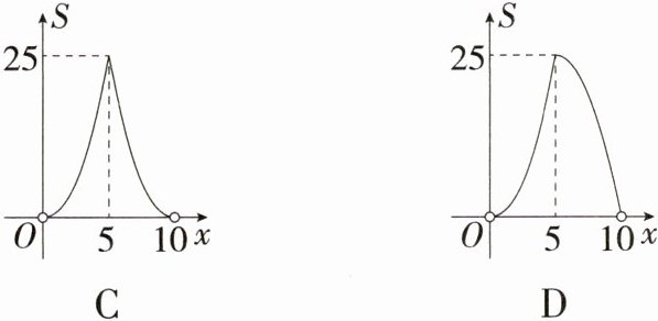 9.如图,在△ABC中,∠B = 90°,AC = 10,作△ABC的内切圆O,分别与AB、BC、AC相切于点D、E、F,设AD = x,△ABC的面积为S,则S关于x的函数图象大致为 ( )