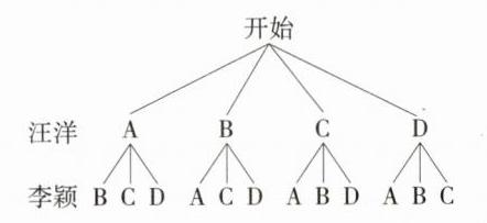 21.[答案含评分细则](2024安徽和县期末)(8分)国际数学家大会是由国际数学联盟主办的国际数学界规模最大也是最重要的会议,每四年举行一次,被誉为“数学界的奥林匹克盛会”.李颖和汪洋两人想通过玩游戏的方式,了解关于国际数学家大会的一些常识,他们在一个不透明的袋子里装了四个分别标有A、B、C、D的小球,这些小球除所标字母不同外其他都相同,汪洋先从四个小球中随机摸出一个,李颖再从剩下的三个小球中随机摸出一个,然后两人各自回答自己所摸小球上字母对应的问题.