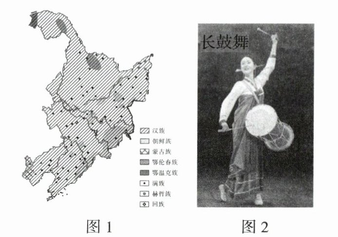 新考向 时事热点2024年7月17日上午10时58分,首趟“龙井号”民俗旅游专列缓缓驶出龙井火车站开往长白山站。160名游客搭乘这趟专列一路欣赏沿途的原始森林生态风光,开启消夏避暑之旅。结合图1东北地区主要民族分布图、图2某少数民族舞蹈,完成8—9题。