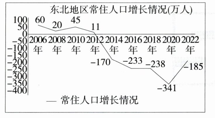 (跨数学)统计图 根据 2022 年全国流动人口动态监测数据,结果表明:东北地区(黑龙江、吉林、辽宁)流出人口目的地按比重排序由高到低依次是山东、北京、河北、天津、广东、上海和内蒙古等七个省区市,在分布格局上存在着明显的群体差异。下图示意东北地区 2006—2022 年常住人口增长情况,读下图完成 4—6 题。