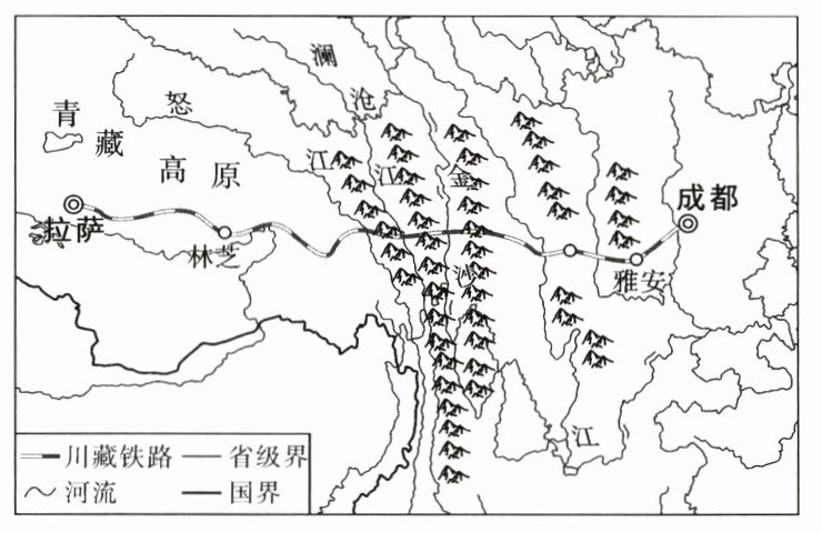 (1)川藏铁路西起青藏高原,平均海拔在4 000米以上,属于我国地势的第______级阶梯;东至________盆地,平均海拔约为500米。雅安至林芝段穿过______山脉(通常为川、滇两省西部和西藏自治区东部山脉的总称);据图概括该段所经地区地形、河流分布特点:______________________________。(8分)