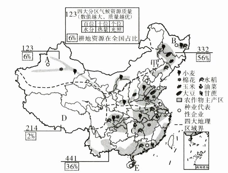 (2)南方地区种植业的优势自然条件是气候资源中______、______资源质量优越,且与______资源配置较均衡。(3 分)