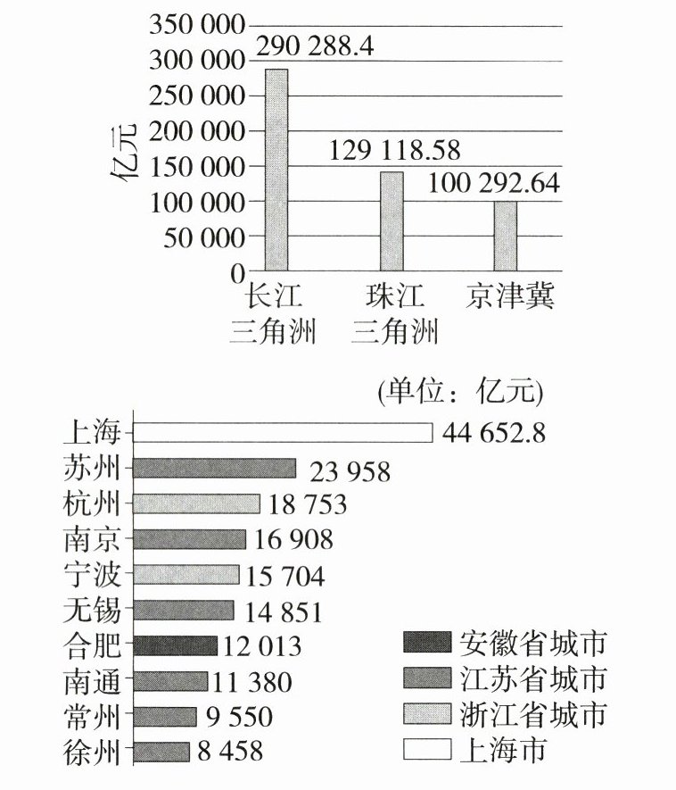(跨数学)统计图 读2022年全国三大城市群经济总量与长江三角洲城市生产总值排名,完成16—17题。