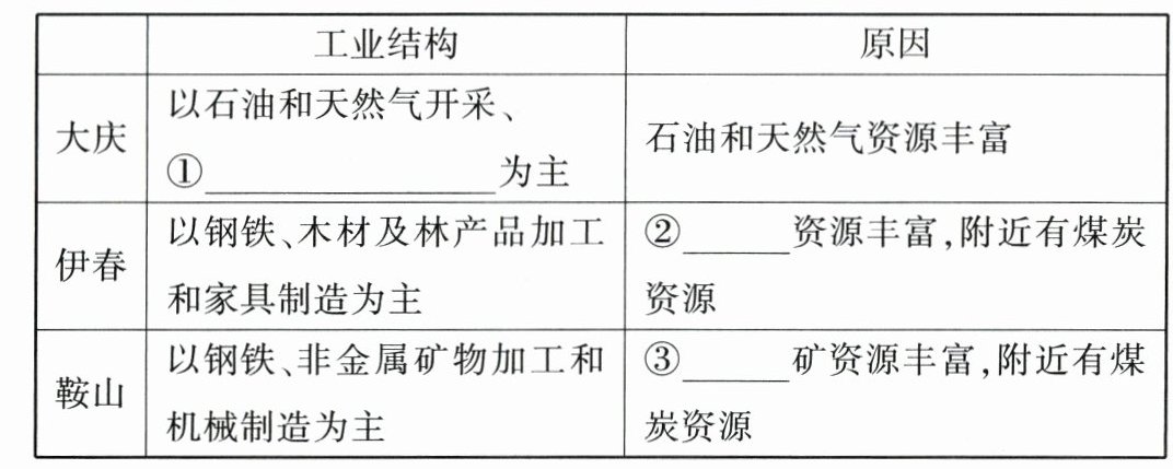 东北@@小兴安岭@@平坦@@黑土@@水源@@石油加工和石油化工@@森林@@铁@@C@@修建滑雪场,开展滑雪运动;修建滑冰场,开展滑冰运动;开展冰雕项目;等(任答其一,答案合理即可)