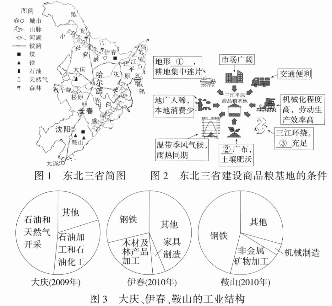 (2)在图2的横线上填写适当词语反映三江平原成为我国著名商品粮基地的条件:①________、②________、③________。(3分)