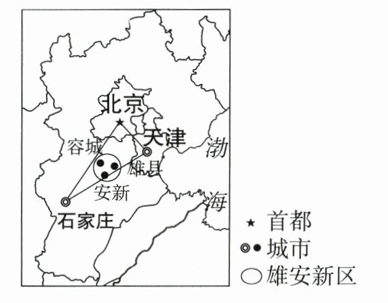 新课标 区域认知 北京正在建设“三城一区”——中关村科学城、怀柔科学城、未来科学城及经济技术开发区。京津冀协同发展对疏解北京非首都职能、推动区域高质量发展具有重要意义。下图示意雄安新区位置,完成10—12题。G8208002