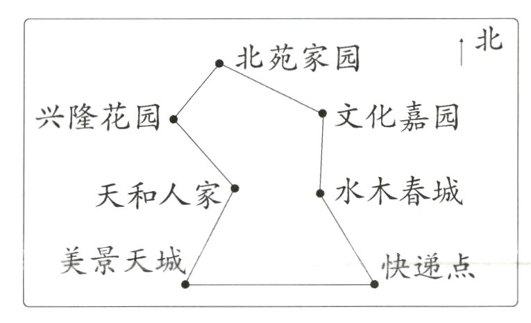 (1)从快递点到天和人家,可以先向( )走到美景天城,再向( )方向走到天和人家。